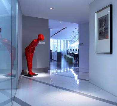 創(chuàng)意辦公室設(shè)計(jì)主要的是與眾不同的體現(xiàn),進(jìn)入辦公室給人一種眼前一亮的感覺。考慮到陽光朝向?qū)k公環(huán)境的影響,室內(nèi)桌子和電腦顯示器遮蔽在靠南的陰影下,另一側(cè)的墻壁擺放各種物件,亂中有序。南寧創(chuàng)意辦公室設(shè)計(jì)裝修,南寧創(chuàng)意辦公室設(shè)計(jì)的設(shè)計(jì)師特別通過色彩對(duì)透明開放和封閉的兩部分進(jìn)行對(duì)比,室內(nèi)搭配明快的顏色,白色、紅色、綠色裝飾物,與室內(nèi)墻面和地面灰白色形成強(qiáng)烈的對(duì)比,顯得跳躍,生機(jī)勃勃。