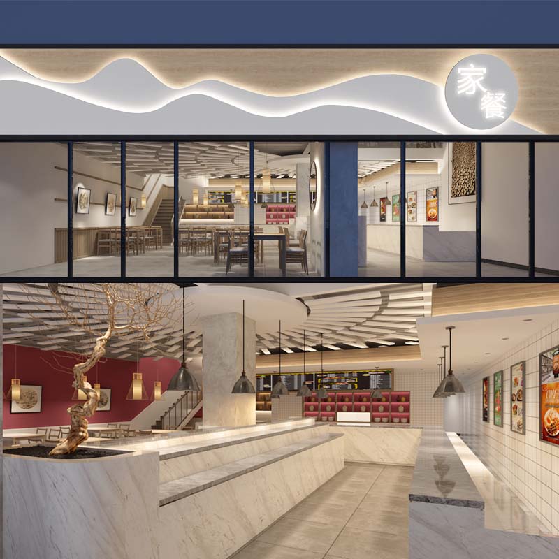 本案例家餐-新中式自助簡餐廳裝修由燦源裝飾全程設(shè)計深化與施工。餐廳地址位于:五象新區(qū)萬科大廈B107商鋪,共2層,單層180平米,loft風(fēng)格,360平。