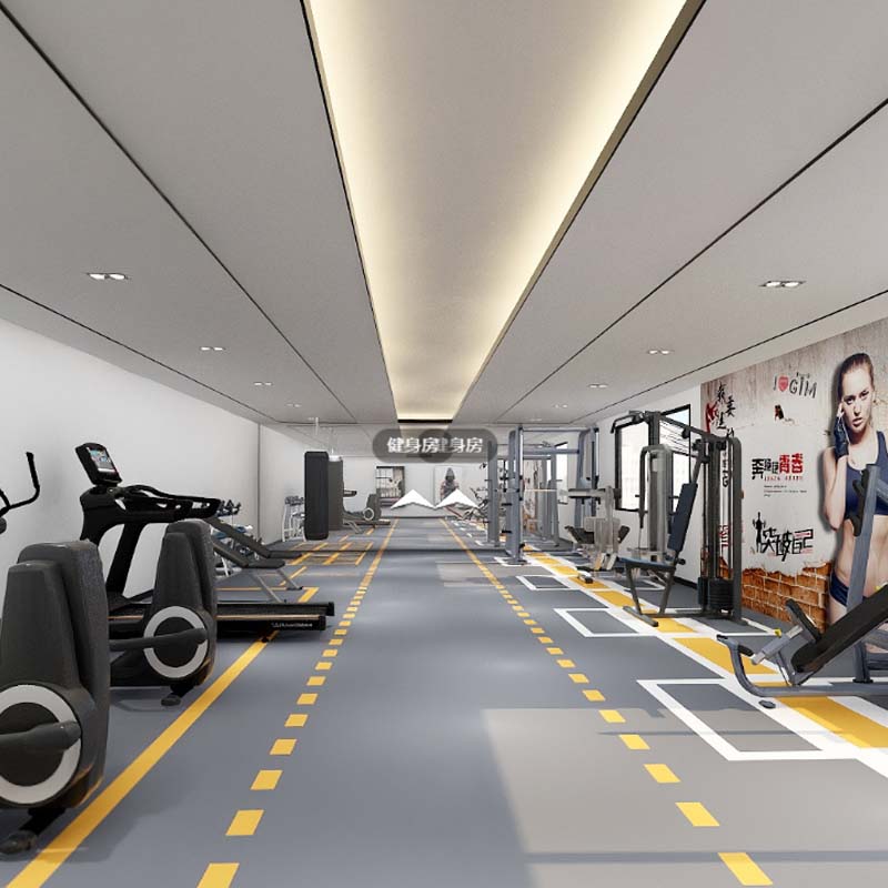 以力量型訓(xùn)練為主的器械區(qū)設(shè)計,當(dāng)然是健身會所設(shè)計裝修中重中之重的部分。采用簡單花色的橡膠地板鋪設(shè),自帶耐磨耐用、低噪音的特殊優(yōu)勢,還能有效保護(hù)地面,防止器械砸傷。搭配石膏板平面吊頂與隱藏?zé)魩У木€條造型,營造井井有條的鍛煉氛圍感。